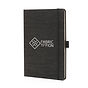 A5 RPET notebook featuring 80 sheets of wood pulp recycled lined paper with pre-printed recycled message, bookmark ribbon, pen loop and elastic closure to keep the pages secure.