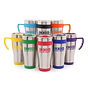 400ml double walled, stainless steel travel mug with PP plastic interior. Includes coloured base, handle, top band and lid with secure sliding sipper. BPA & PVC free.
